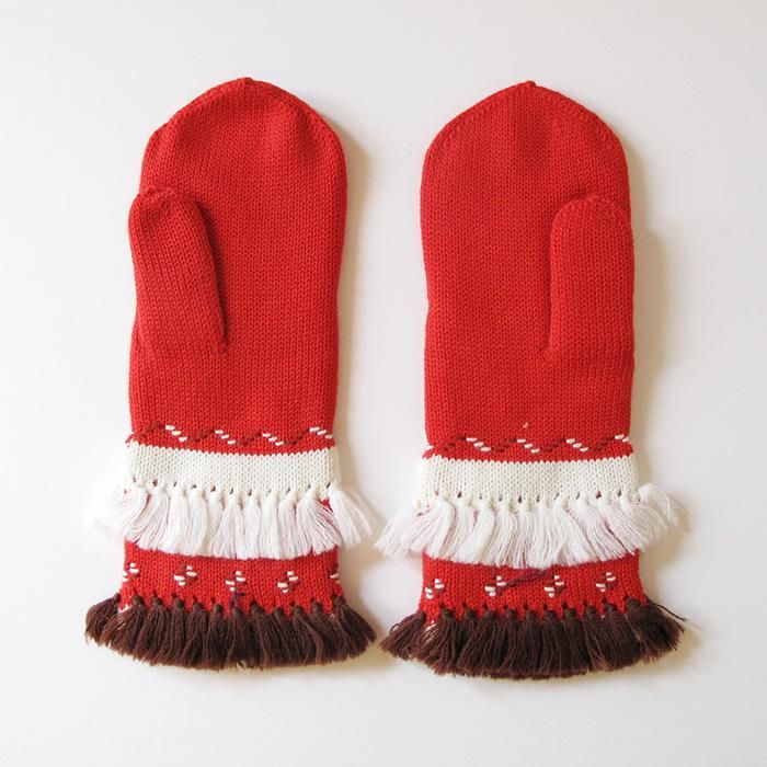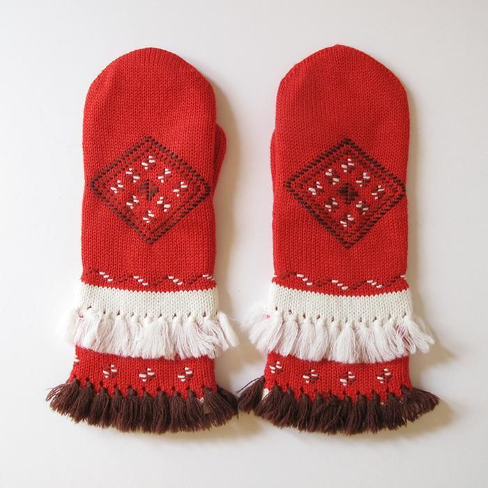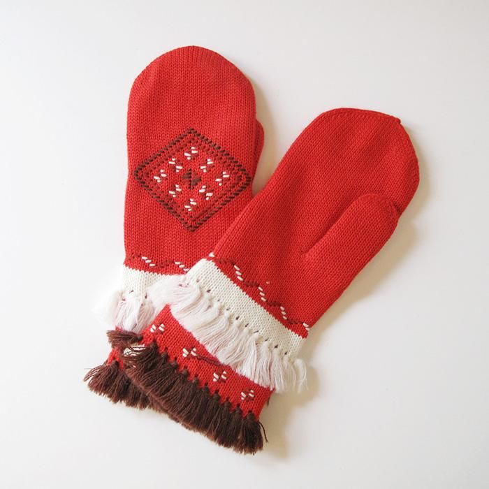 北欧の伝統的なハンドメイドミトンはさきっちょが三角なのがかわいい。こちらのミトンは色使いも素敵ですよ。ざっくりとした手編みのミトンは、冬のコーディネートのポイントになりますよ。