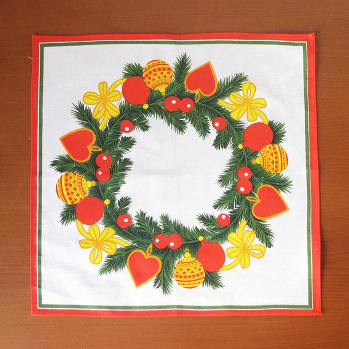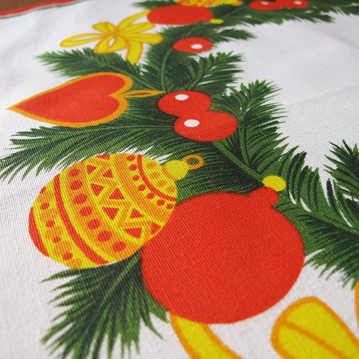 華やかなクリスマスリースがテキスタイルいっぱいにデザインされています。テーブルの真ん中はもちろん、サイドボードやローテーブルにもおすすめですよ。