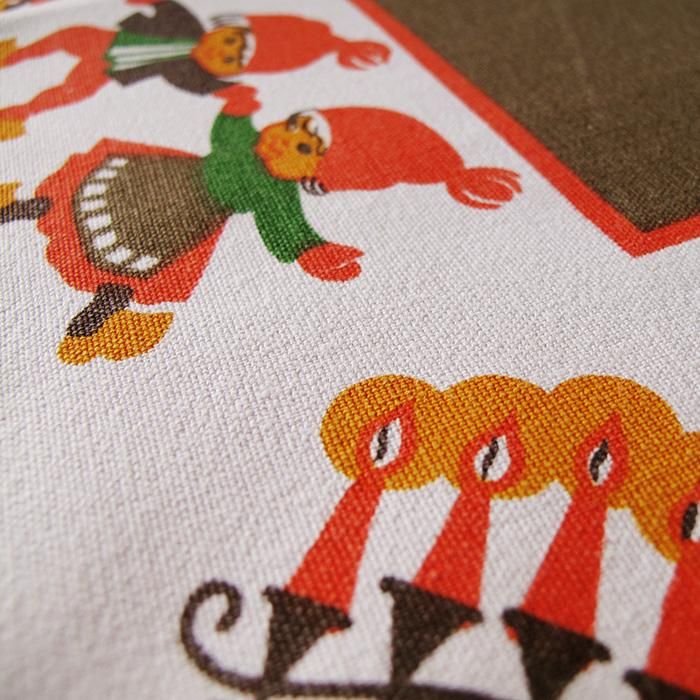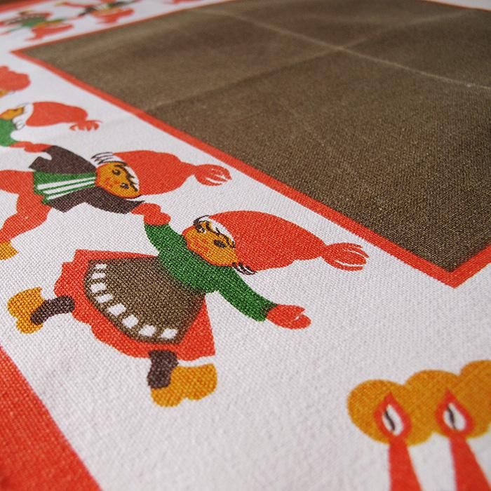 明るい色使いとかわいらしく踊るトムテたちがなんともキュートなデザイン。テーブルの真ん中はもちろん、サイドボードやローテーブルにもおすすめですよ。