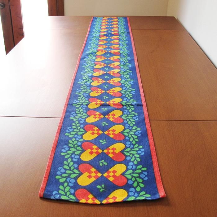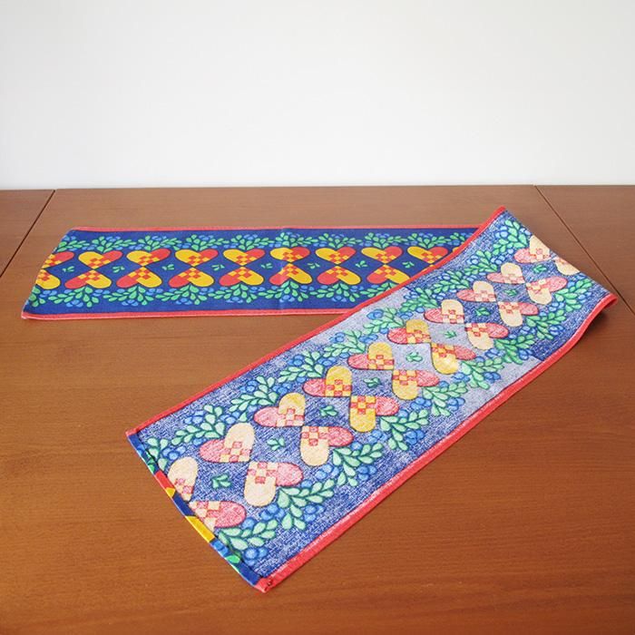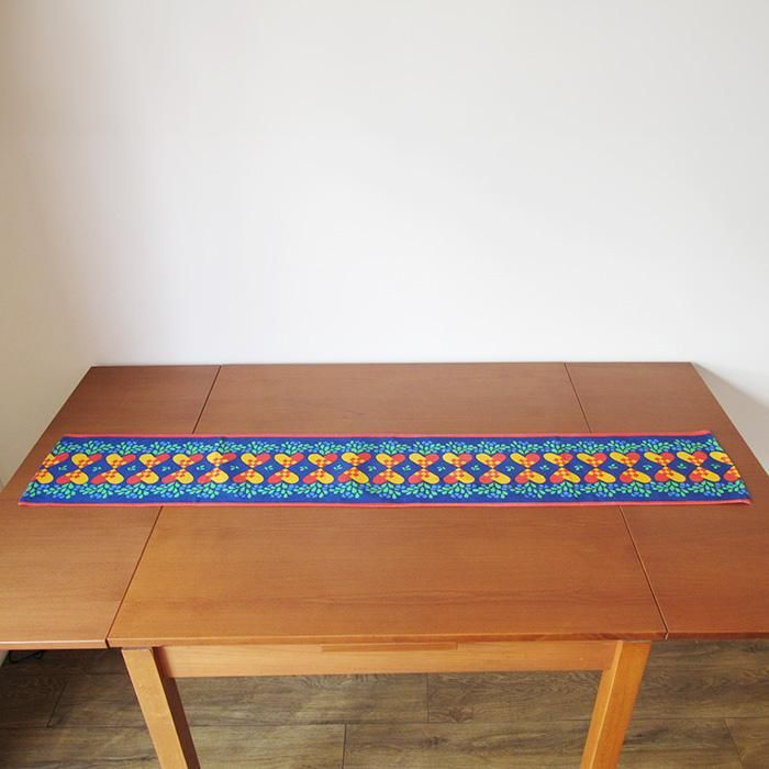 北欧のクリスマス飾り「ユールヤータ」が並んだ明るい色使いが魅力的なランナー。1m越えのたっぷりサイズが嬉しいですね。サイドボードやテーブルの上にオススメのランナーです。