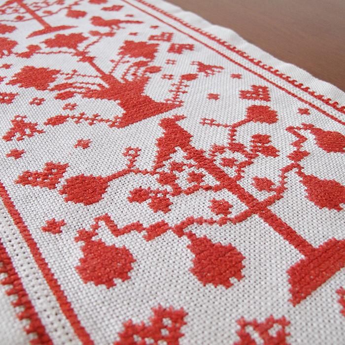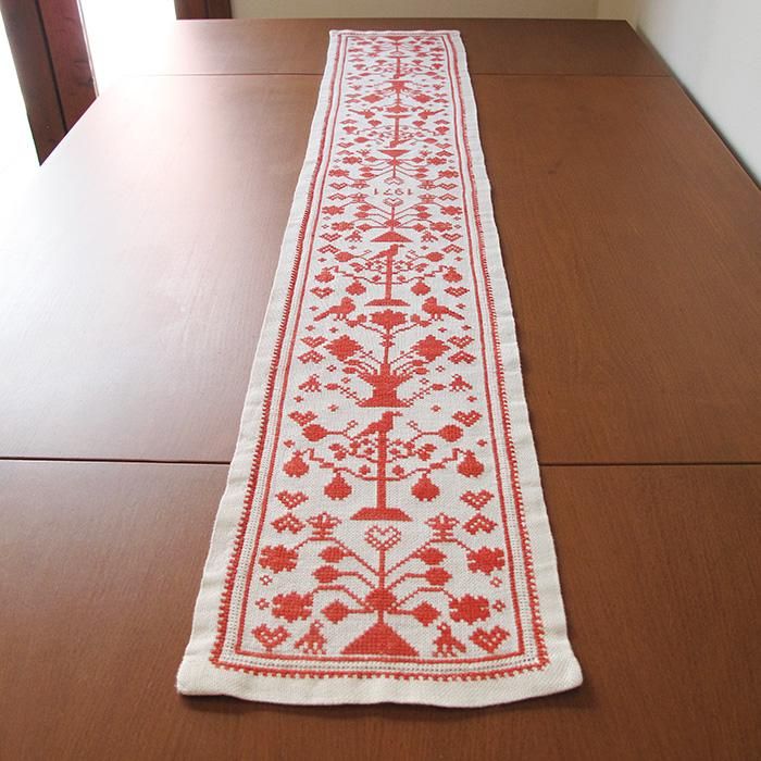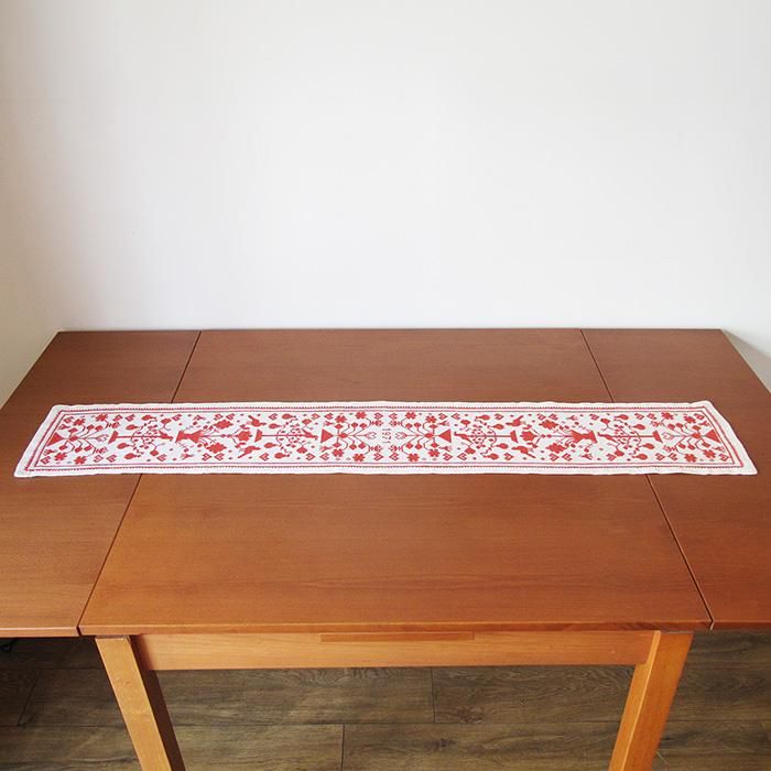 白いリネンに赤い刺繍がたっぷり。1mを超える嬉しいサイズです。サイドボードやテーブルの上にオススメ。北欧の「てしごと」を堪能できる一枚です。