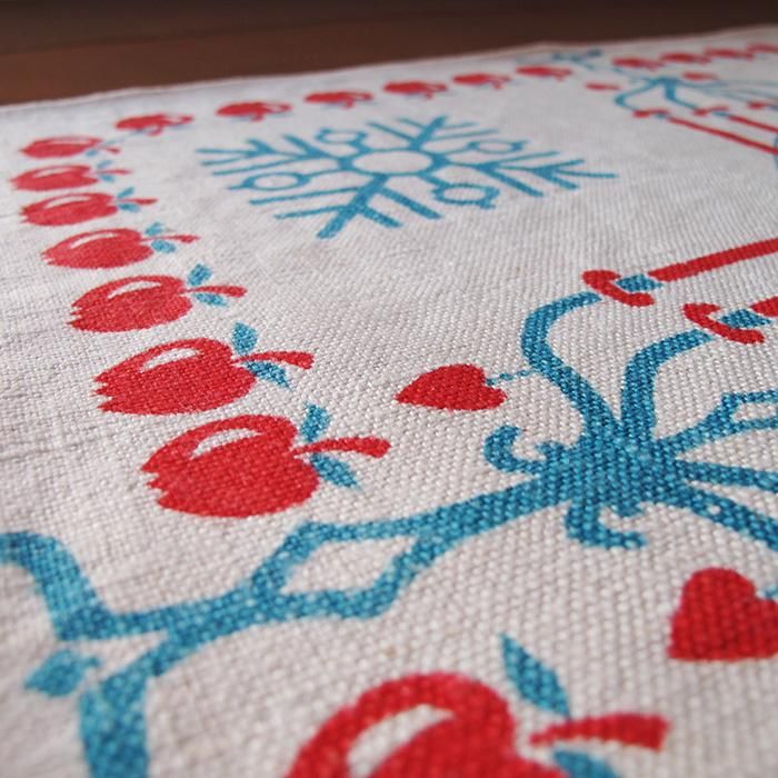 肉厚なリネン生地にクリスマスらしいモチーフが色鮮やかにデザインされています。テーブルの真ん中はもちろん、サイドボードやローテーブルにもおすすめですよ。