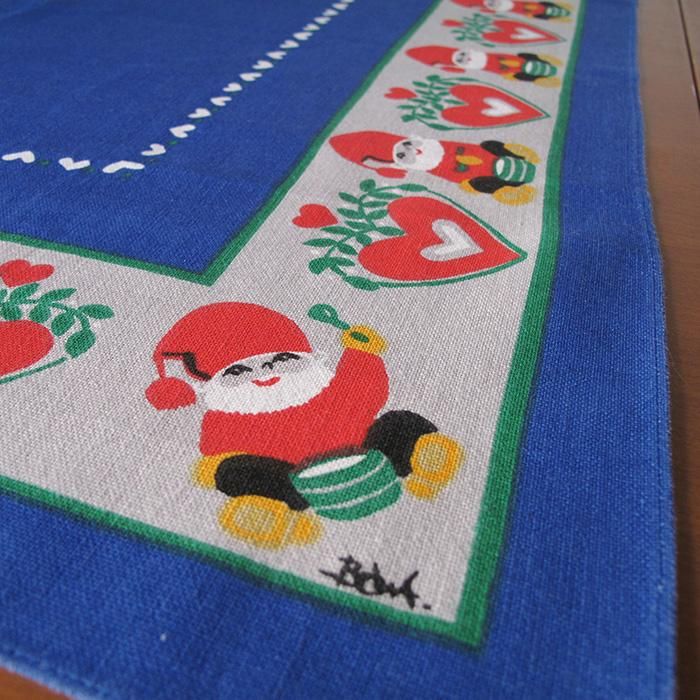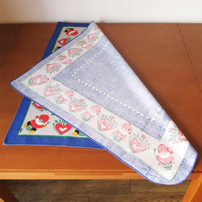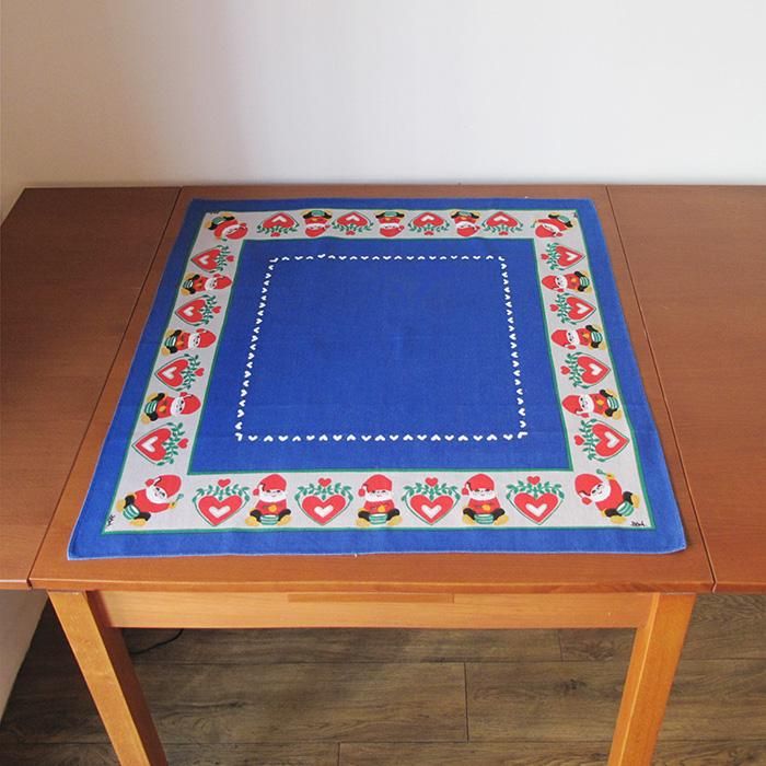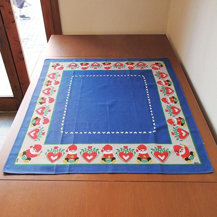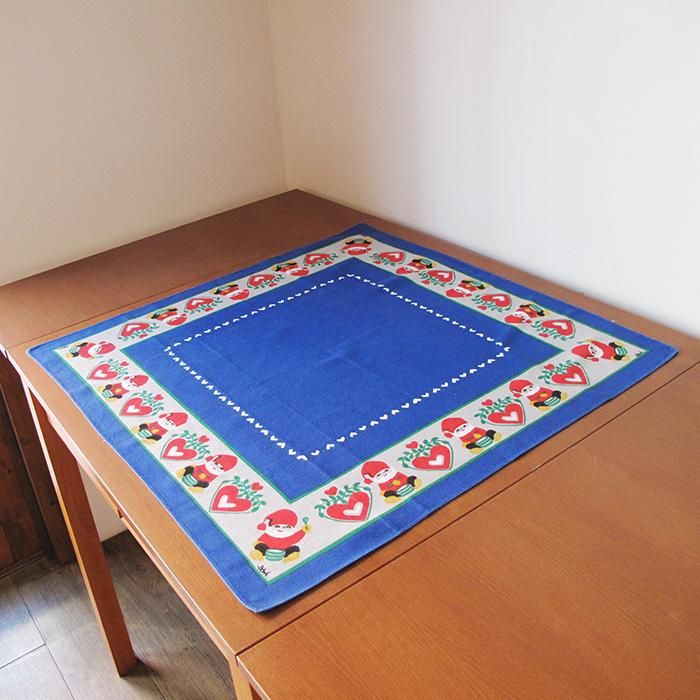 肉厚な生地に青を基調にしたトムテのデザインが素敵。正方形、円テーブルはもちろん、横に長いテーブルにも斜めに敷いたり、無地のクロスに重ねても素敵ですよ。