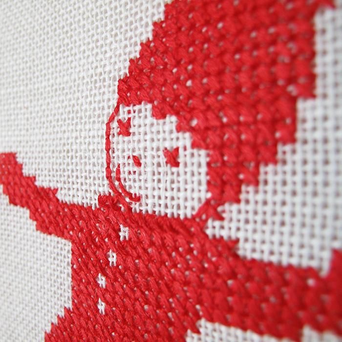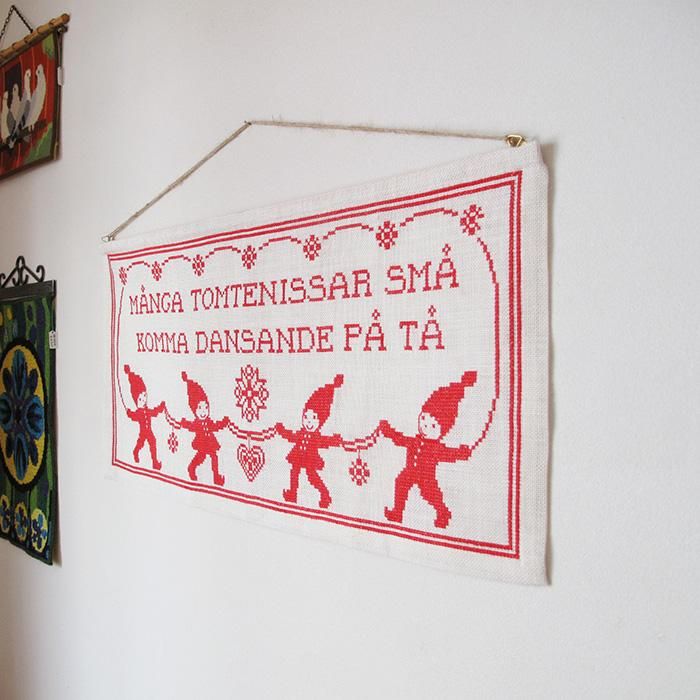 手を繋ぐトムテたちがかわいらしくステッチされています。白いざっくりとしたリネンに赤一色の刺繍というところも魅力的ですね。壁にかけるだけでクリスマスらしさを演出できますよ。
